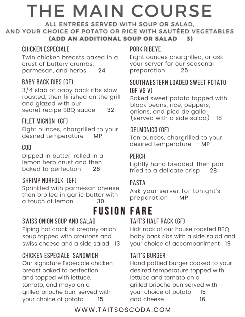 Check out our Menu Image Gallery Not all items are pictured and some items are seasonal or specials not offered on the main menu. DinnerLunchSpecialsDesserts Full Rack Ribs Loaded Sweet Potato Breaded Cod Shrimp Norfolk Chicken Especiale Cheeseburger Chicken Alfredo (Pasta rotates weekly) Swiss Onion Soup Cheeseburger Swiss Onion Soup Club Car Split Pea Soup (Soup of the Day) Blackened Salmon on Black and Blueberry Salad *Not all Items are pictured yet French Dip Special Pork Cordon Bleu Special Blackened Chicken Alfredo Pasta Special (all cheesecakes rotate weekly/daily) Peppermint Cheesecake (all cheesecakes rotate weekly/daily) French Vanilla Creme Inquiry Contact us There was an error trying to submit your form. Please try again. NAME * This field is required. PHONE NUMBER * This field is required. EMAIL ADDRESS * This field is required. INQUIRY SUBMIT There was an error trying to submit your form. Please try again.